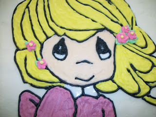 This was a birthday cake that I made with only 24 hours notice, but still I was glad to be able to make it for them (and strengthen my skills under pressure;)). Their daughter is a good friend of my daughter and her mom requested a Precious Moments cake. It is a chocolate 1/2 sheet cake covered in buttercream. The image was also made using buttercream, flowers are royal icing.